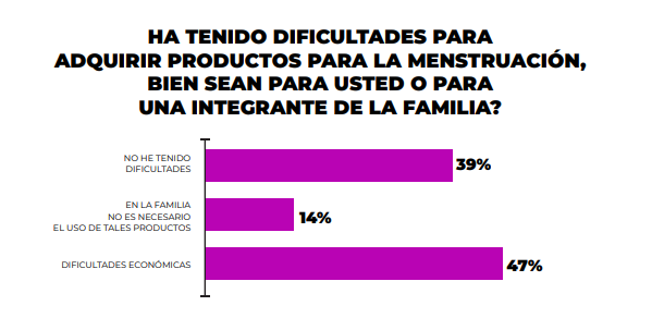 El 47% de las mujeres consultadas manifestó haber tenido dificultades en la compra de productos para la menstruación. Quienes tienen dificultades para adquirir dichos suministros, no pueden hacer frente a la carga financiera que supone la compra, por tal razón su vulnerabilidad económica es patente.
