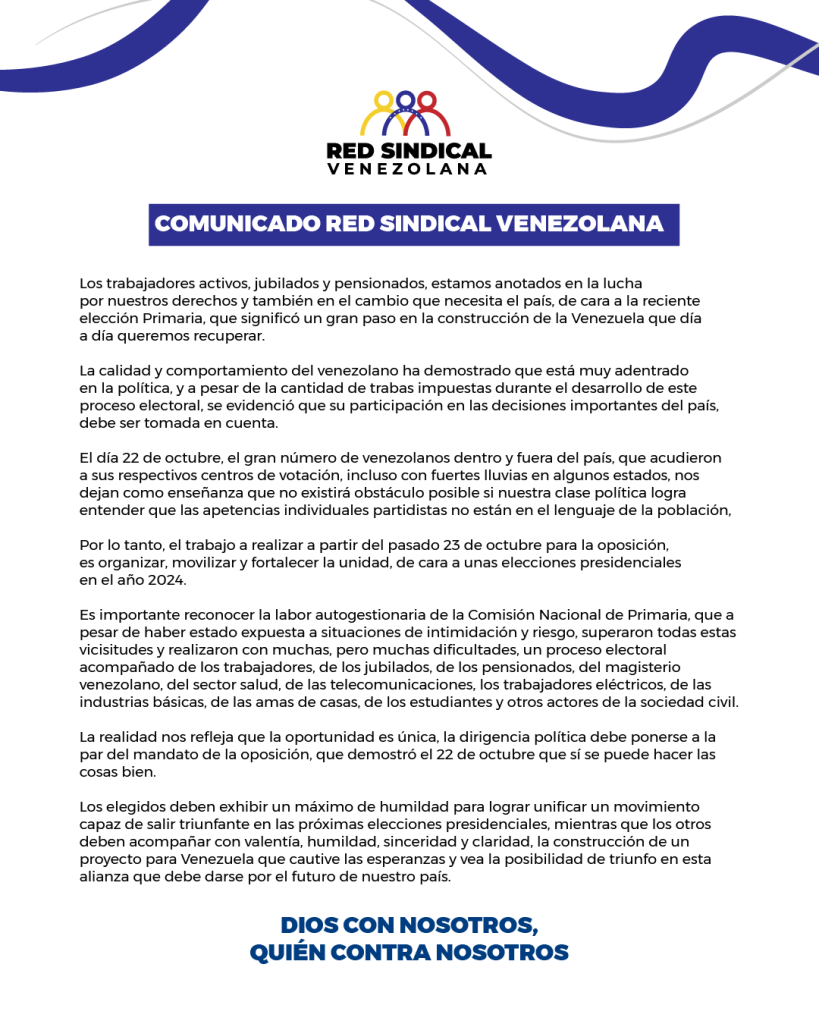 La Red Sindical Venezolana, que agrupa a trabajadores activos, jubilados y pensionados de diversos sectores, emitió un comunicado en el que expresó su apoyo al proceso de elecciones primarias que se realizó el pasado 22 de octubre, y que consideró como un gran paso en la construcción de la Venezuela que día a día queremos recuperar.